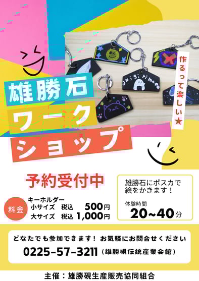 大変お待たせいたしました。 雄勝硯伝統産業会館での雄勝石ワークショップを再開いたします。 ◆キーホルダーへの絵付けワークショップ 雄勝石に絵をかいてオリジナルのキーホルダーをつくります! 会場:雄勝硯伝統産業会館(宮城県石巻市雄勝町下雄勝2丁目17番地) 体験時間:20~40分程度 持ち物:特になし...