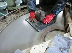切断した原石を円盤状の回転すり盤機の上にのせ、そこに川砂と水を流し込み、表面の凸凹を削り滑らかにします。