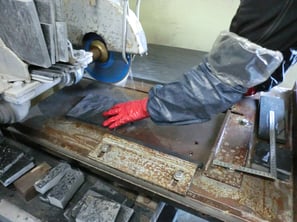 選別された良質の原石を、製品の大きさ・厚さ・形を考えて切断します。