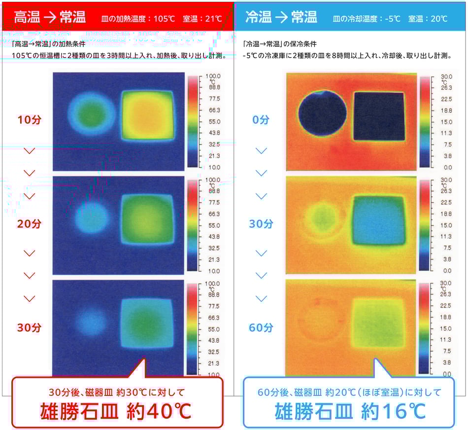 雄勝石皿と一般的な磁器皿の保温性と保冷性についてサーモグラフィで温度変化を計測・比較しました。